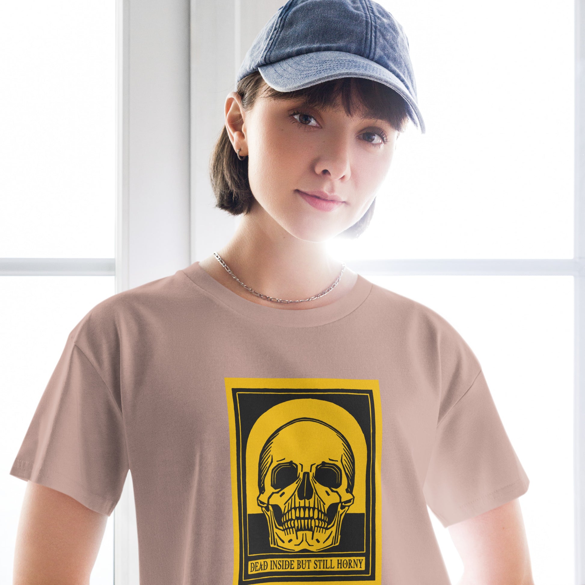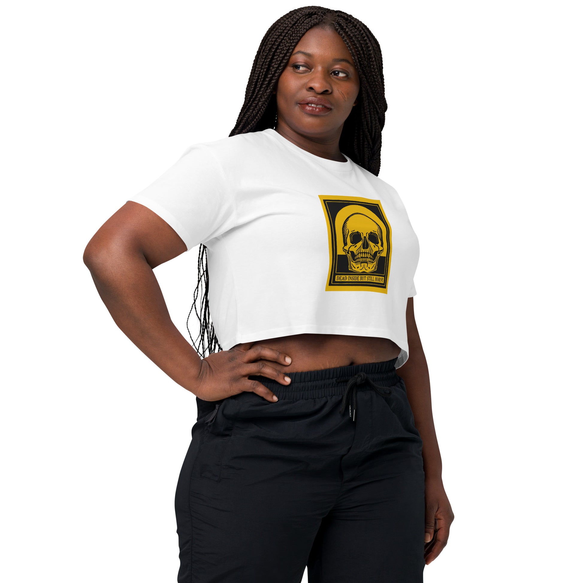 Turn up the contrast with this yellow Dead Inside crop top, featuring a vintage skull graphic and sarcastic attitude in bold, moody detail. Made from ultra-soft 100% combed cotton, it’s breathable, durable, and perfect for jaded folks who still have urges.